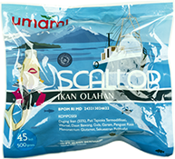 Umami Scallop produk dengan harga ekonomis hadir untuk keluarga anda. Terbuat dari daging ikan, sayur dan bumbu pilihan. Cocok untuk campuran masakan maupun digoreng.